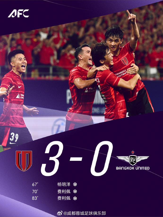 今晚,闪耀亚洲!2025/2026亚足联冠军精英联赛附加赛,成都蓉城主场迎战曼谷联(泰国)。上半场蓉城将士攻势凶猛,但双方均未取得进球,半场比分0-0。下半场易边再战,罗慕洛开出角球,杨明洋甩头攻门得分,1-0,成都蓉城取得亚洲赛场首粒进球!仅2分钟后费利佩单刀破门扩大比分,2-0!第83分钟,费利佩再度破门得分,成都蓉城3-0锁定胜局!最终,成都蓉城以雷霆之势3-0力克劲敌,成功进军亚冠精英联赛正赛!费利佩也以梅开二度,当选为本场比赛最佳球员!
